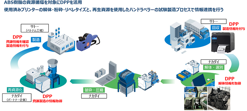 本PoCでは、サトー製のラベルプリンターを対象に、廃棄のための回収から解体・破砕、再生素材の製造、再生素材によるハンドラベラーの試験製造に至るプロセスを用い、DPPの社会実装に資する具体的なモデルケースを検証します。