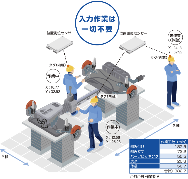 例えば、作業者のヘルメットや製造ラインに取り付けたタグを読み取り、位置情報から作業内容を把握できます。