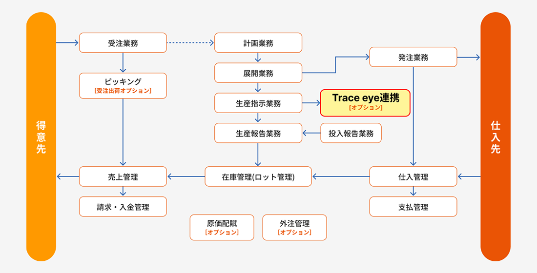 配合表(レシピ)での手配管理やロットトレース機能など、在庫・品質・原価管理強化を図り、製造現場の運用にも柔軟に対応します。