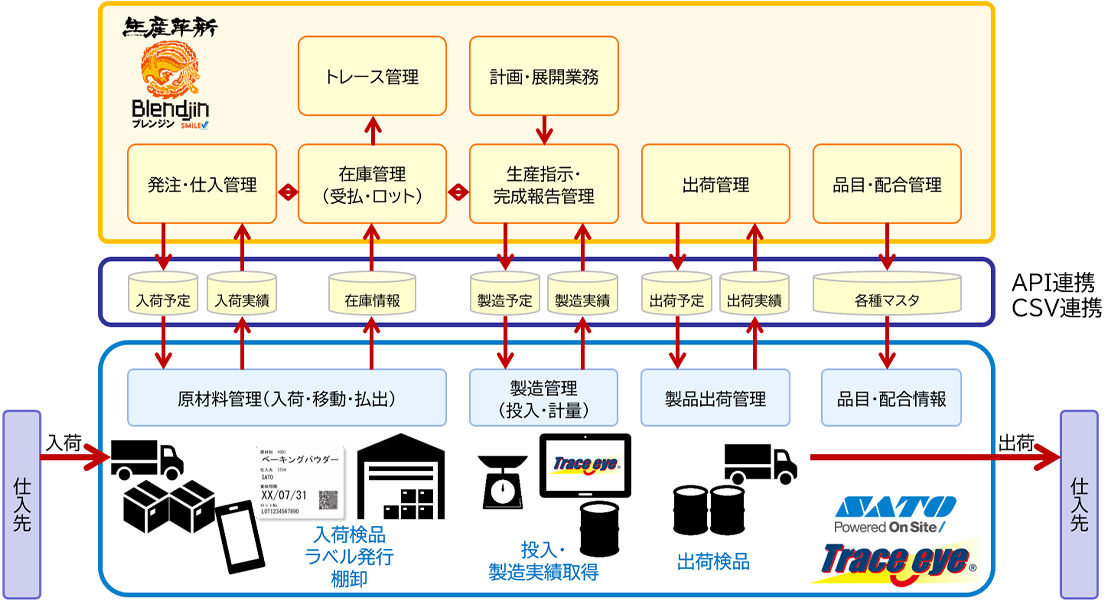 「Trace eye®」を連携させることで、原材料の管理(入荷・在庫・移動)や製造の管理(計量・投入)が可能です。ハンディターミナルを使った読み取り作業や、計量器と連携し配合量のチェック等の現場作業を支援いたします。