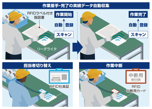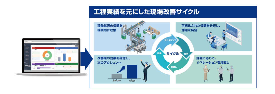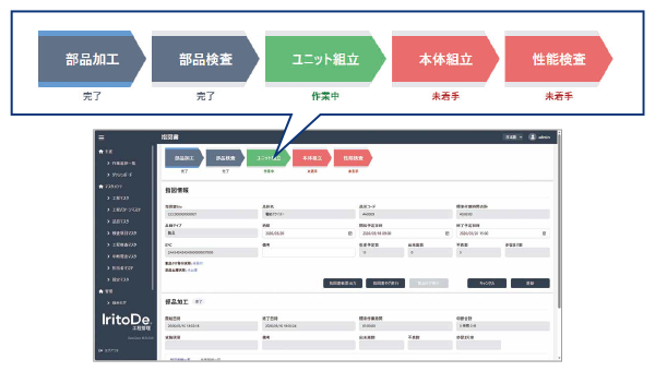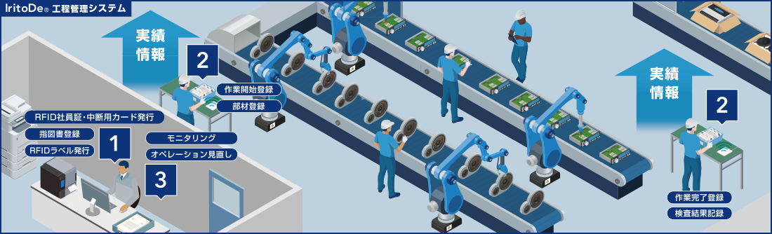 RFIDを活用するIritoDe 工程管理は、工程ごとの作業開始・終了の実績を取得し、進捗や作業履歴をリアルタイムに可視化します。現場の状況を「見える化」することで、遅れや異常を早期に把握し、迅速な対応を可能にします。また、データに基づく改善活動を支援し、ムダの排除や業務の標準化を促進します。