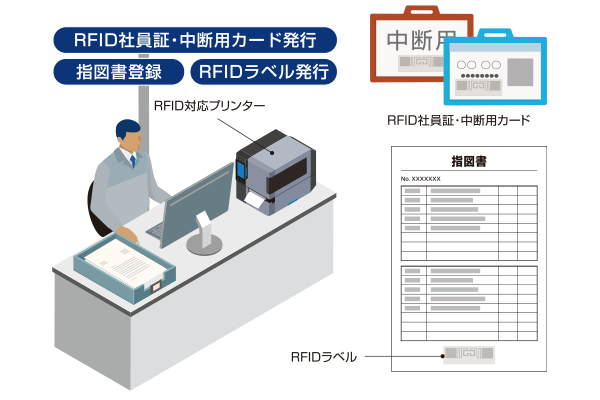 次に指図書(作業指示書)データを登録し、RFIDラベルを発行、指図書に貼り付けて現場で使用します。