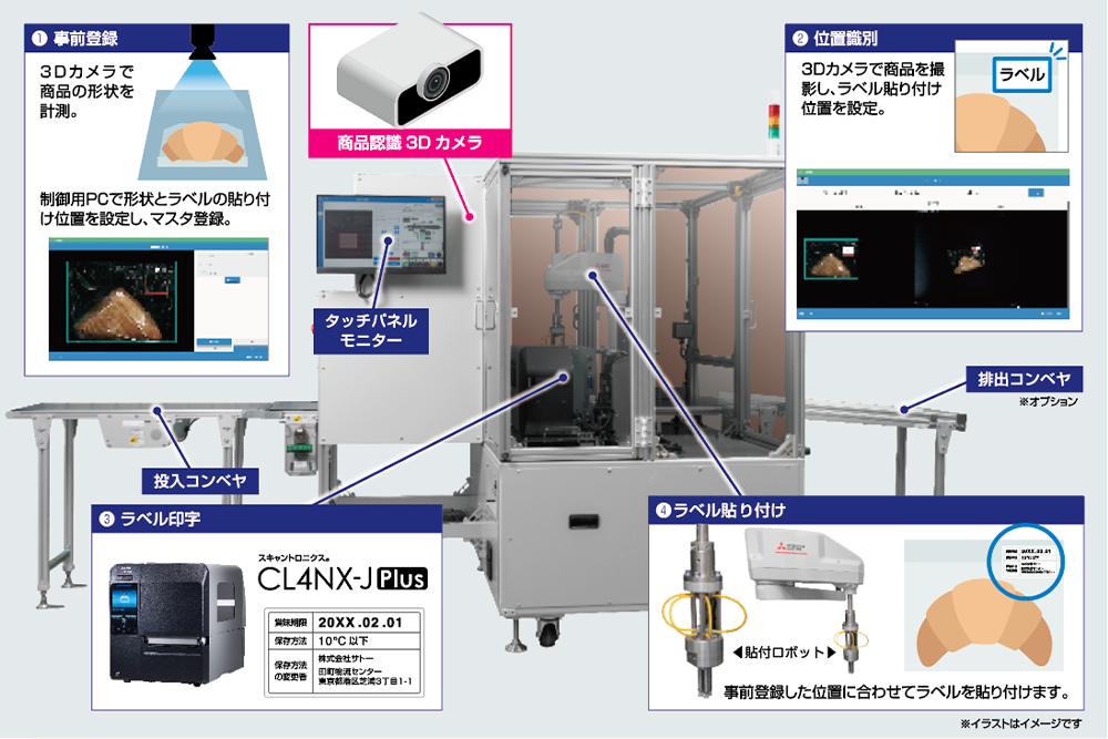- 3Dカメラで形状(高さ・位置・向き)を計測。形状が不揃いの商品や無地のパッケージ商品でも位置を自動検出し、正確なラベル貼り付けが可能