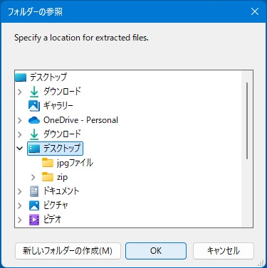 4.解凍先をどこに保存するか参照先が表示しますので「デスクトップ」を選択しOK。