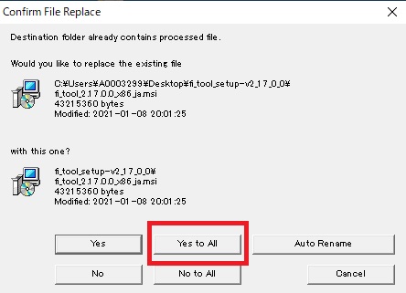 上書きして良いですかと尋ねています。「Yes to All」を選択してください。最新ファイルになります。