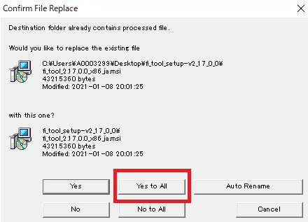 ※もし左記の画面が表示した場合、既にelabe_designer-v...が存在しているためで、 上書きして良いですかと尋ねています。「Yes to All」を選択してください。最新ファイルになります。