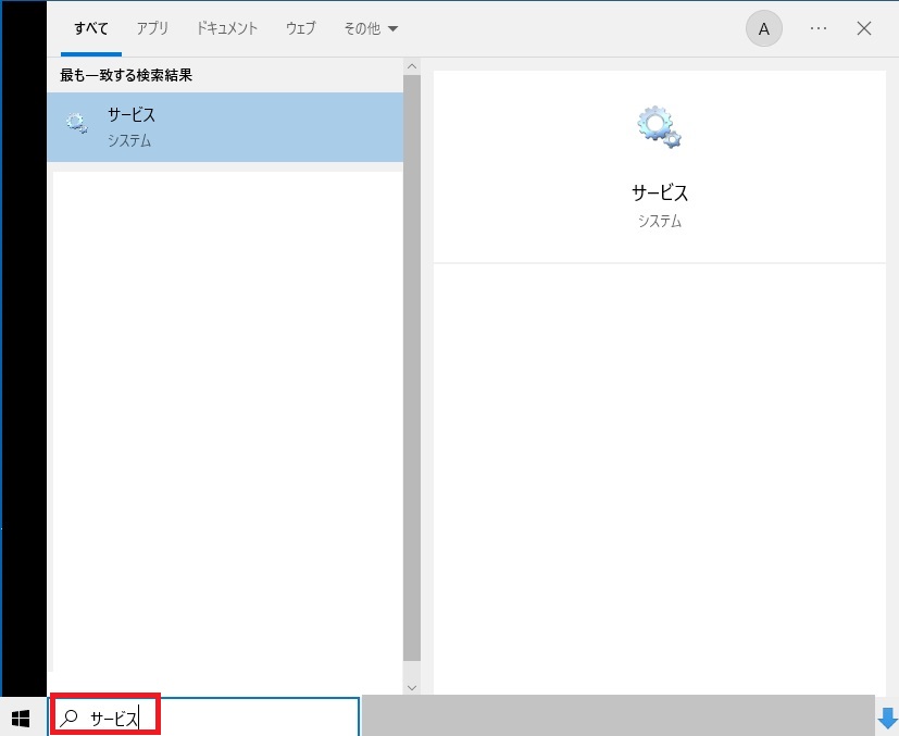 ①.スタートメニュー右横の「ここに入力して検索」欄に「サービス」と入れ、