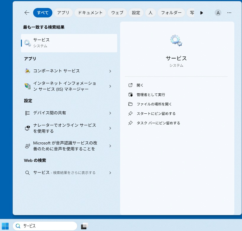 Windows11の場合、上部「すべて」で表示しない場合、「アプリ」に変更することでサービス(歯車)が表示します。