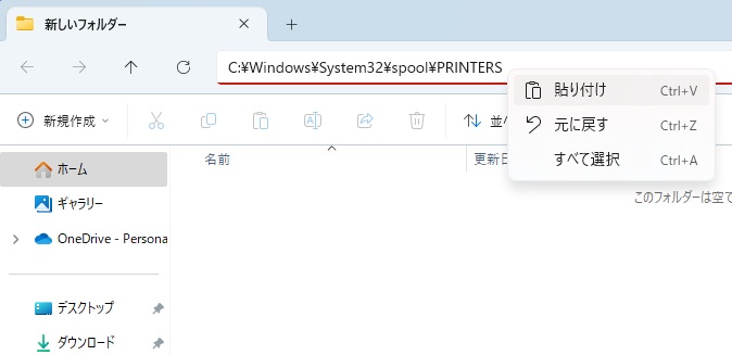 ③マイコンピュータから「C:\Windows\System32\spool\PRINTERS」を開き、そのフォルダ内のファイルをすべて削除します。