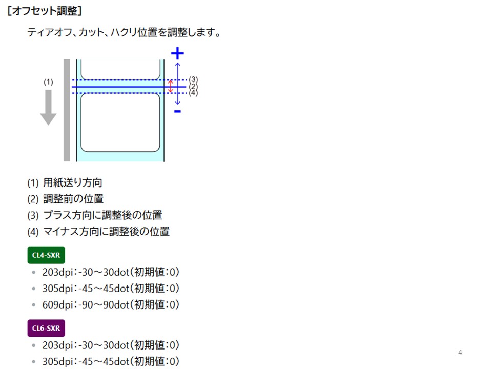 用紙停止位置、カット位置の調整方法は、WEBマニュアルで、”オフセット調整”と検索し、